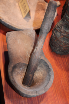 佤族以大米為主食。西盟地區(qū)的佤族都喜歡把菜、鹽、米一鍋煮成較稠的爛飯。其他地區(qū)的佤族則多吃干飯。農(nóng)忙時(shí)日食三餐,平時(shí)吃二餐。雞肉粥如茶花稀飯是家常食品的上品。旱稻多現(xiàn)吃現(xiàn)舂,男女老幼皆食辣椒,民間有“無(wú)辣子吃不飽”之說(shuō)。副食是青菜類、瓜類、酸竹筍、鹽、辣椒、蔥、蒜等。肉食主要是牛、豬、雞、狗以及獵獲的獸、禽、松鼠、田鼠、魚(yú)、螺螄、螃蟹、蜂兒等。一些地區(qū)的佤族還有捕食昆蟲(chóng)的習(xí)慣,更食用蛹、寄生于草木植物的紅毛蟲(chóng)、掃把蟲(chóng)和寄生于冬瓜樹(shù)的冬瓜蟲(chóng)等十余種。一般是把可食的昆蟲(chóng)與米一起煮成粥,加菜、鹽、拌辣椒,香辣可口(兩圖為舂米和舂米用具,劉軍攝影)。