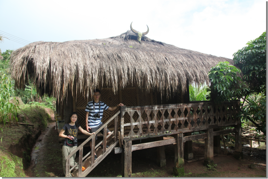 普通房子:房子內(nèi)部隔做兩間(主間與客間)。在客間的西端開—“鬼門”,連接鬼門的外邊一般都架置一個(gè)掌子(用竹子和木料搭成的七、八平米的涼臺(tái)),有的在房子左邊靠客門外架一個(gè)掌子,用途是曬晾糧食、衣物,或堆放雜物等,白天婦女還可以在上面做針線活。房子的前廈是放置牛頭或推集糧食的地方,后廈下面喂豬、雞和放杵碓。房子右邊開有一道“火門”,在“火門”右前方栽有牛角叉,左邊栽有牛尾巴樁。