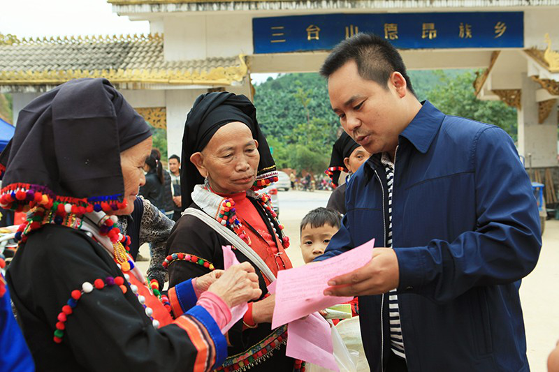 三臺(tái)山徳昂族鄉(xiāng)鄉(xiāng)長(zhǎng)楊愛(ài)明和德昂族群眾參加農(nóng)業(yè)科技推廣活動(dòng)