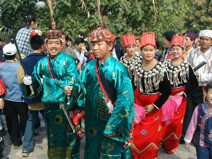 目瑙節(jié):又稱“總戈”,景頗語(yǔ)音譯,意思是“大伙跳舞”。目瑙節(jié)是景頗族最盛大的傳統(tǒng)節(jié)日,一般于每年農(nóng)歷正月十五以后的九天內(nèi)擇雙日舉行,節(jié)期三至五天不等。目瑙作為一種大型的群眾性歌舞活動(dòng),由來(lái)已久,歷史上,每逢豐年,出征、凱旋、婚姻嫁娶、敬祭鬼神等重要活動(dòng),均要跳“目瑙”。景頗族的“目瑙縱歌”原來(lái)是一種融宗教和文化習(xí)俗為一體的傳統(tǒng)慶典。隨著社會(huì)的發(fā)展,逐漸演化為各種不同類別的“目瑙”。大致有以下幾種:①“歲目瑙”,家庭財(cái)源茂盛,人丁興旺時(shí)舉行;②“布當(dāng)目瑙”,征戰(zhàn)取得勝利時(shí)舉行;③“貢冉目瑙”,同胞兄弟分家自立門戶時(shí)舉行;④“騰肯目瑙”,新建房屋住所落成時(shí)舉行;⑤“空然目瑙”貴族家娶親辦婚禮時(shí)舉行;⑥“達(dá)如目瑙”,出征時(shí)舉行;⑦“昔目瑙”,有名望的長(zhǎng)者去世送葬時(shí)舉行;⑧“柱目瑙”,祭奠“木代”神時(shí)舉行。不同類別的“目瑙”都有特定的內(nèi)容和表現(xiàn)形式,但有一個(gè)共同點(diǎn)就是整個(gè)過(guò)程都是由“瑙雙”(領(lǐng)舞)隊(duì)和“瑙巴”(表演)隊(duì)組成的舞隊(duì)來(lái)表現(xiàn)和完成的。每逢目瑙節(jié)日,村村寨寨的景頗人身著節(jié)日盛裝,紛紛從四面八方涌入目瑙廣場(chǎng)。廣場(chǎng)上人山人海,氣氛熱烈歡快而不失莊嚴(yán)古樸的特色。廣場(chǎng)中央高豎著四根長(zhǎng)約4米的目瑙柱,亦稱雌雄柱,中間兩根為陰,外面兩根為陽(yáng),上面皆繪有精美而富有象征意義的圖案:右邊柱上往往繪以蕨菜花紋,象征團(tuán)結(jié)奮進(jìn);左邊常畫回紋構(gòu)成若干個(gè)四方形,并涂以不同顏色,表示景頗族的遷徙路線;中間兩根柱子之間,交叉著兩把長(zhǎng)刀,為景頗民族驍勇強(qiáng)悍、堅(jiān)強(qiáng)剛毅性格的具體標(biāo)志。目瑙柱的左側(cè)立著一個(gè)方形架子,上層是吹嗩吶的座位;前面掛著一個(gè)兩米長(zhǎng)的大皮鼓和一面直徑一米多的大芒鑼,供跳舞時(shí)伴奏用。廣場(chǎng)四周用竹籬笆圍起,目的是為了防止野鬼的侵入和牲畜的干擾。舞蹈開始時(shí),鼓樂(lè)齊鳴,由兩位德高望重且又熟悉目瑙舞路線的老人身穿大龍袍,頭戴飾有孔雀、野雞羽毛和野豬牙齒的目腦帽,手持長(zhǎng)刀領(lǐng)頭,后面跟著背銅炮和持長(zhǎng)刀的隊(duì)伍,婦女們拿著扇子或彩帕跟在最后,邊歌邊舞,熱鬧非凡。參舞者少則百多人,多則幾千人,從清晨到日暮,以日暮到清晨,通宵達(dá)旦,其間舞者跳累時(shí)可自動(dòng)退場(chǎng)小歇片刻,然后繼續(xù)登場(chǎng)舞蹈?!澳胯Эv歌”作為一個(gè)民族的傳統(tǒng)活動(dòng)發(fā)展至今,宗教色彩和類別已日益淡化,它已成為景頗族約定俗成的傳統(tǒng)節(jié)日,統(tǒng)稱為“統(tǒng)肯(傳統(tǒng))目瑙”并賦予了新的內(nèi)涵,其內(nèi)容和形式都是展示一個(gè)民族的傳統(tǒng)文化,反映今天的新生活和對(duì)未來(lái)的美好向往。