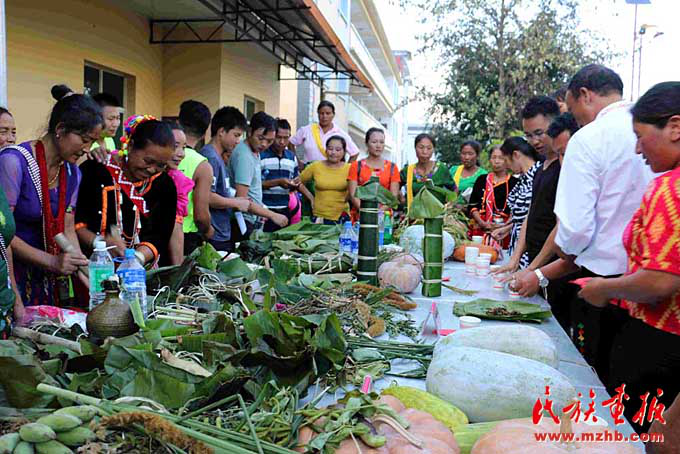 尚立文向記者介紹說:“以前景頗族過年,大年三十,一部分男人在家殺年豬,其余的就上山打獵。景頗族很慷慨,凡是獲取到的獵物,見者都有份。女人除了在家準(zhǔn)備年夜飯,也會上山或下壩子采野菜等。但不管是打獵的還是摘野菜的,都必須在太陽落山前到家,闔家歡度春節(jié)吃年夜飯?,F(xiàn)在生活好了,不打獵不摘野菜了,但還是得遵循太陽落山之前到家的習(xí)俗?!?/p>