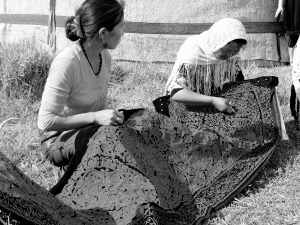 秋來春往,花落花開,瑪利亞從小女孩長成大姑娘,她的繡藝也日漸嫻熟,結(jié)繡、鉤繡、扎繡、刺繡、串珠片繡、格子架繡、十字繡……在日復(fù)一日的飛針走線中,她練就了一雙巧手和溫柔內(nèi)斂的性格?,斃麃喞C花,先勾勒花朵的輪廓,再用細(xì)的色線填滿輪廓內(nèi)的空間,由外向內(nèi),一圈一圈、一層一層,直到色彩飽滿的圖案凸現(xiàn)出來。草原上黃色的野菊、白色的蒲公英、藍(lán)色的薰衣草、紅色的刺玫,都像被擷取了精靈似的,綻放在柯爾克孜女人的繡品中,流露出她們與自然界溫暖而平和的情感交流。