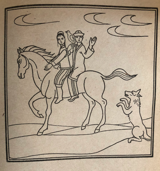 汗想坐得靠近那個美女一點兒,可是,他剛往前一湊,美女一下子變成了狼,上去把汗抓了個頭破血流,然后很快地跑掉了。狼又從后面趕上了少年和那位姑娘。少年又對狼說:“我也不想跟這匹馬分開了,能不能想個辦法呢?”狼說:“可以?!痹诨氐降谝粋€汗的附近時,狼又搖身一變,變成了一匹駿馬。少年牽著駿馬送到汗那里。汗回謝以后,就給了他那只金絲鳥。少年帶著金絲鳥和姑娘一起騎上馬又走了。