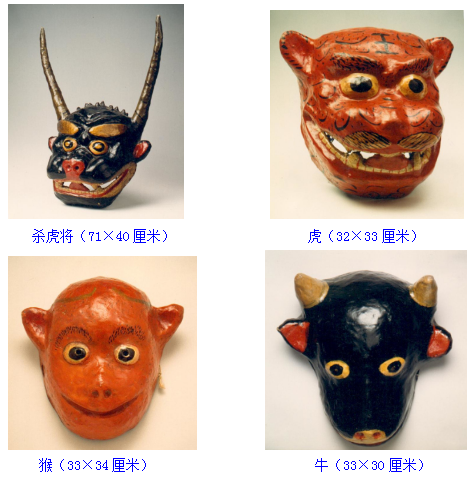 “殺虎將”反映的是當(dāng)?shù)匾暈樯酵鯛數(shù)臍⒒槊癯?,降伏老虎的?nèi)容。面具角色有牛、虎、猴、殺虎將。牛象征農(nóng)民,代表善,虎和猴象征禍害。表演牛和虎、猴激烈打斗,當(dāng)牛被打敗倒地時,殺虎將持劍上場,打殺格斗等場面。此時場外觀眾上場助戰(zhàn),直至將虎降服,整個場面熱烈緊張。