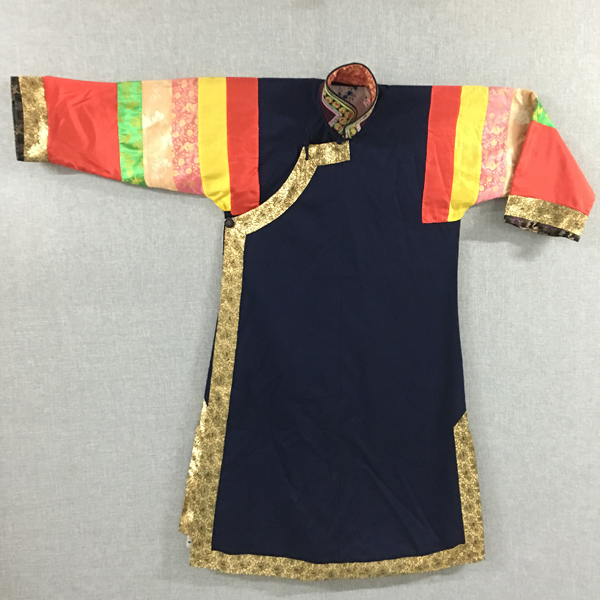 民族文化宮博物館收藏的這件立領(lǐng)右衽大襟五色袖“彩虹衣”,是土族女子盛裝時(shí)的一種服飾,征集于青海省互助土族自治縣。年代為20世紀(jì)30年代?!安屎缫隆遍L117厘米,胸圍120厘米,袖長59厘米,棉質(zhì)。整件女服右衽大襟,藍(lán)棉布襯里,左右側(cè)開衩,黑色“拉花”立領(lǐng),領(lǐng)上以土族傳統(tǒng)刺繡工藝—盤繡刺繡紅綠相間圓形圖案和辮形線條,綴三枚金色圓銅扣。衣袖為紅、黃、綠、白、粉五色彩布、彩緞拼接的“彩虹袖”,其中紅色為主色,占整個衣袖約一半面積,其余四色布塊相鄰,均勻分布于衣袖上方,布塊上刺繡有金色梅、蘭、竹、菊圖案。衣袖袖口鑲寬約3厘米黑色絲絨底刺繡花邊,花邊里外均繡有花草紋樣,做工精致。花邊上接寬約10厘米金色牡丹紋花邊,與襟邊、下擺、衩口等處所貼金色牡丹紋花邊相互呼應(yīng),極富設(shè)計(jì)感。