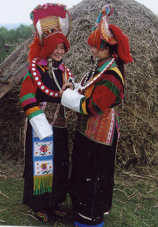 土族婦女服飾樣式繁多、色彩絢麗。頭飾大致有扭達、氈帽、禮帽、包頭等。扭達是土族婦女的主要頭飾,有學者認為,可能是由古代的頭盔、戎裝演變而來。扭達種類很多,其中以互助、大通等地的“吐渾扭達”最為古老、尊貴。因“吐渾扭達”形似圓餅,也被稱作“干糧頭”。實際上,“吐渾扭達”為圓形布坯,以彩色布條鑲出圖案,邊緣飾以彩穗,背面上沿密密的插以鋼針,非常艷麗而華貴。土族婦女穿“秀蘇”,即花袖衫,俗稱“七彩袖”。長衫為繡花小領斜襟,兩袖用紅、黃、藍、綠、紫、黑、白七色布縫制。長衫上一般套穿黑色、藍色或紫紅色鑲花邊坎肩,腰系彩帶,腰帶左側通常系有小鈴鐺。土族婦女著褲裝或裙裝。褲子也多為大襠褲,褲子膝下部分套黑色或藍色的褲筒,土語叫“貼彎”。土族婦女的裙裝在土語中稱為“胡爾美”,一種是互助等地的紅色蝴蝶裙,另一種則是民和地區(qū)的百褶花裙,顏色艷麗、美觀大方。土族女士鞋通稱為“恰繞”,又可分為“腰鞋”“拉云子鞋”“其吉得鞋”等。各種“恰繞”等縫接腰襪,鞋尖飾彩色短穗,后跟縫合處接三指大小紅布溜跟。土族婦女還喜歡戴耳墜、耳環(huán)和項圈等首飾。婦女所戴項圈,土語中稱“索爾”,由硬質的布片和金屬片制成。老年婦女的服飾不似青年婦女鮮艷多彩,主要穿小領、斜襟長衫以及素色的坎肩、圓氈帽、“過家”鞋等。