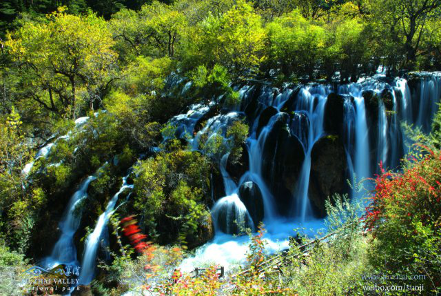 九寨溝四周群山聳峙,有雪峰數(shù)十座,高插云霄,終年白雪皚皚。河谷地帶奇水薈萃,其間有成梯形分布的大小湖泊114個(gè),瀑布群17個(gè),鈣華灘流5處,泉水47眼,湍流11段,以1870米的海撥高差,在12 座雪峰之間穿林跨谷,珠連玉接,呈Y字型串珠,逶迤近60公里,形成了中國唯一、世界罕見的以高山湖泊群和瀑布群以及鈣華灘流為主體的風(fēng)景名勝區(qū)。湖泊小者數(shù)平方米,最大的長海長達(dá)7公里。湖水終年碧藍(lán)澄澈,色彩斑讕,在陽光照射下,呈現(xiàn)出藍(lán)、黃、橙、綠等多種色彩,絢麗奪目。天氣晴朗時(shí),藍(lán)天、白云、雪山、森林倒映湖中,水光浮翠,美麗如畫,并隨季節(jié)推移呈現(xiàn)出不同的色彩和風(fēng)韻,有“九寨歸來不看水”之說。