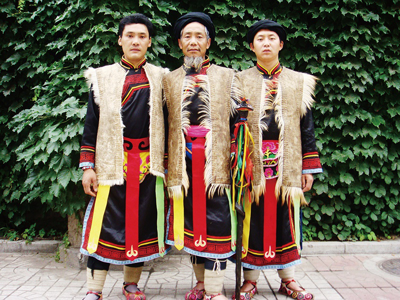 圖片左為楊俊清,中為老釋比朱金龍(楊俊清的老師),右為余正國(原是一名當(dāng)?shù)氐那颊Z老師)。他們是當(dāng)?shù)赜忻尼尡取?   梁黎2008年攝于北京