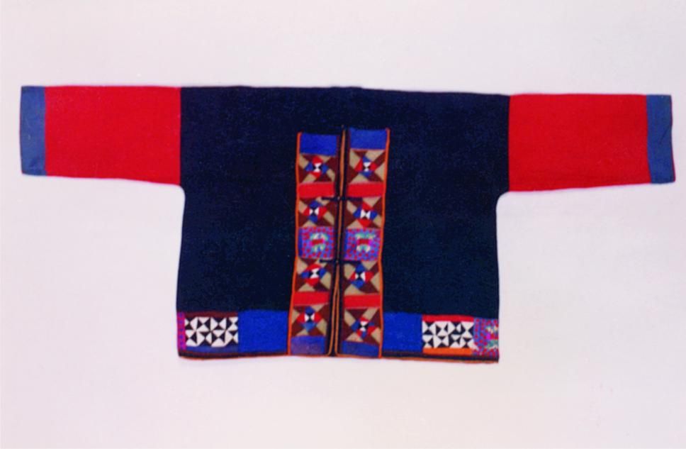 剪花衣又為“縑花衣”,是清末明初阿昌族已婚婦女的一種上衣,主要流行于云南省德宏傣族景頗族自治州梁河縣阿昌族地區(qū)。這種衣服的特點是:毛質(zhì)地,多為深色,長袖圓領(lǐng)對襟,釘圓銅扣,前襟和衣服四周均用各種顏色的方形或三角形布片鑲縫成幾何形圖案。中間還夾雜著刺繡花紋圖案。過去,姑娘出嫁與新郎拜堂和年老去世時都要穿著剪花衣服。前者表示夫妻白頭偕老,生死不離;后者被認(rèn)為到陰間可以和親人相會團(tuán)聚。久而久之,穿剪花衣成為阿昌族的特定風(fēng)俗。