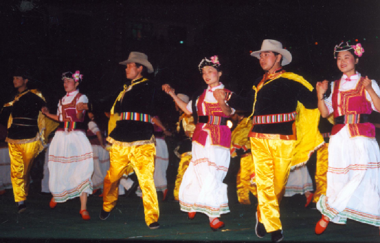 普米族的民間娛樂舞蹈,普遍具有歌、舞、樂三位一體的特點(diǎn)。舞蹈形式正如普米族民歌所唱的:“如金線把珍珠穿成一串,手拉手跳成十五的月亮?!眾蕵肺璧溉鞘掷洲D(zhuǎn)圓圈的舞蹈形式。人們挽手而跳,伴以高亢洪亮、情感激越的唱詞。特別是普米族婦女雪白的長(zhǎng)裙隨舞步輕盈飄旋,似白鷺翻飛,正如《打跳歌》中所唱的:“笛聲不停莫歇腳,舞場(chǎng)上沒有陡巖子,腳底板下沒有刺,跳它個(gè)地動(dòng)山也搖?!痹谙矐c的集會(huì)之夜,歡快的娛樂性舞蹈,往往一跳就是通宵達(dá)旦。跳鍋莊是普米族傳統(tǒng)的舞跳形式,這種舞蹈不受時(shí)間空間的限制,只要一支竹笛或葫蘆笙,有一塊空地即可進(jìn)行,少則三五人,多則數(shù)百人。一般總是在傍晚,在院內(nèi)或場(chǎng)壩上舉行。跳舞時(shí),總要在中間燃起一堆火,與室內(nèi)的鍋莊相似,所以稱之為鍋莊舞。鍋樁內(nèi)容很豐富,從古代的游牧、狩獵、紡織到今天的趕街、慶豐收、烤酒等都有反映。流行的曲調(diào)有《放單調(diào)》《出山》《獅子舞》等等。現(xiàn)在,鍋莊舞已發(fā)展成為集唱詞、曲調(diào)、舞蹈、音樂于一體的綜合性歌舞藝術(shù)。