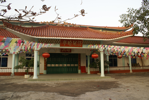 澫尾哈亭是京族哈亭中最為講究的一個。哈亭的頂部呈“八”字形兩面坡,是先用鋼筋水泥鋪平,然后再蓋上土紅色琉璃瓦,四角建成飛檐。屋脊正中立有“雙龍戲珠”雕塑,哈亭大門門楣上掛的是書寫有“哈亭”二字的大牌匾,旁邊的墻體上用紅漆寫明哈亭建造的相關情況。哈亭正門前有一敞開式的小亭,作為哈亭的輔助裝飾部分,可用于哈節(jié)期間接待來賓休息。小亭的門楣上掛有一塊小牌匾,上書金黃色的“澫尾哈亭”字樣,頂部也立有彩塑“雙龍戲珠”,不過此彩塑沒有哈亭大門正上方頂部的“雙龍戲珠”大。