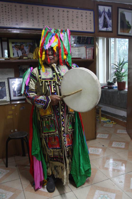 冬天穿的鞋是“奇哈密”和“溫得”,“奇哈密”是用狍脖皮或犴皮做靴底,用狍腿皮拼縫成靿的短靴?!皽氐谩笔怯寐够蜥砥ぷ龅?,鹿或犴腿皮拼縫成靿的長(zhǎng)靴?!皽氐谩币?yàn)殪壐撸齑┲颢C不易灌雪。這兩種靴子都要用冬季絨毛狍皮做成的襪子配套穿用,暖和跟腳,踩在雪地上沒(méi)有聲響。夏天一般穿“奧勞其”,是一種皮底布靿短靴?!翱己袈洹保怯枚窘q毛狍皮縫制的二指手套,掌面腕部留一縫口,手從縫口中伸出,手套仍護(hù)在手背上,既使在零下40度的嚴(yán)寒中處理獵物,也不用擔(dān)心手被凍壞。還有一種五指狍皮手套,背面正中繡花、蝶等中心圖案,五指的關(guān)節(jié)和指甲處繡出各種小型圖案,然后用連理枝將中心圖案和關(guān)節(jié)、指甲圖案連為一體,中心圖案代表手掌,手指圖案代表關(guān)節(jié)和指甲,連理枝代表骨骼和血脈(圖為越來(lái)越鮮見(jiàn)的薩滿服飾,吳雅芝供圖)。
