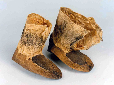 魚皮靴俗稱魚皮靰鞡,由魚皮四周整體向上折起,抽褶向上形成底部,前面與鞋臉縫制在一起,形成半圓形,鞋口再用另一塊魚皮縫上,形成圓筒形靴靿,然后穿繩或皮條做鞋帶。此鞋由身、臉、黝三部分組成。魚皮鞋既結(jié)實(shí)保暖,又抗寒防水防滑,適于在冰上和泥濘道路上行走及從事漁獵生產(chǎn)。如圖所示。