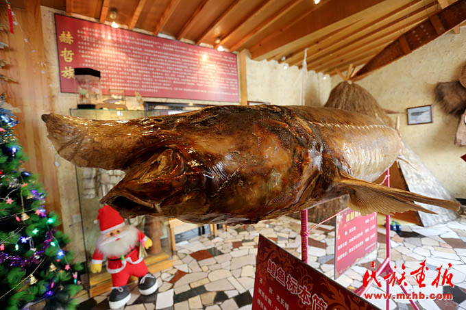 赫哲人把餐廳開到了京城,成為向外界展示赫哲族文化的窗口。圖為赫哲族餐廳內(nèi)57歲的大鰉魚標(biāo)本,體長2.5米,重達(dá)286斤(陳濤 攝影)