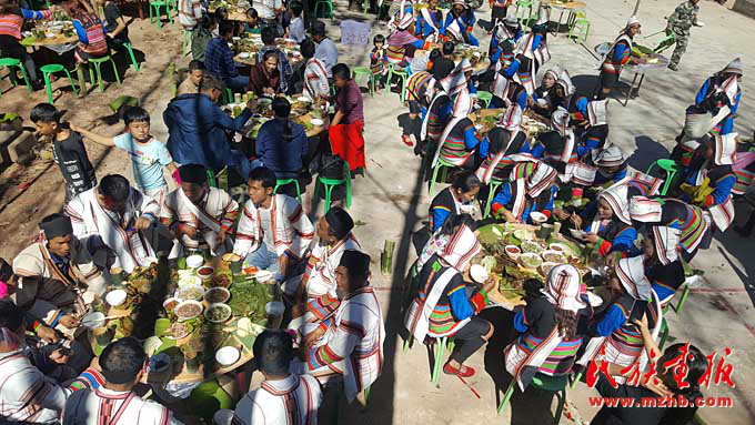 “過去過節(jié),手頭拮據(jù),經(jīng)常是三五戶人家湊錢殺一頭豬。由于物質(zhì)匱乏,節(jié)日前,男女老幼都上山挖野菜,殺豬當(dāng)天,到地里砍芭蕉花,帶上柴火去寨老家里煮年飯吃,節(jié)日第三天去寨老家唱歌跳舞。” 記者聆聽著87歲基諾族老人周白講述基諾山寨的回憶。如今的他已是四世同堂,在耄耋之年能享受天倫之樂,過上幸福生活,他心存感激。節(jié)日當(dāng)天老人們在村委會聚餐,席間接受年輕人的敬酒與祝福,其樂融融。