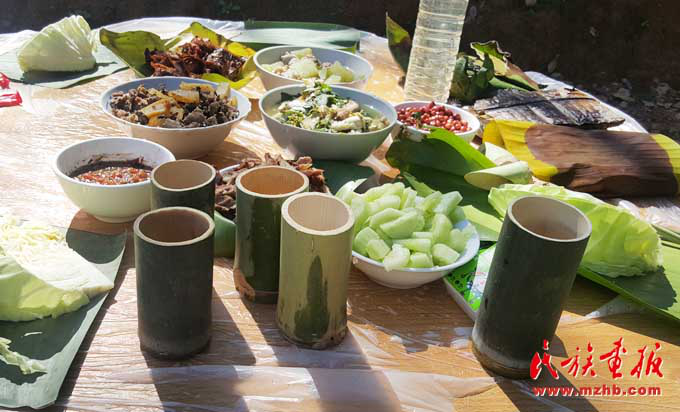 基諾族地區(qū)食材豐富,一日三餐,以大米為日常主食,雜以玉米、瓜豆等。每年5—9月的雨季,基諾山漫山遍野是食材,山藥、水芹菜、竹筍、魚腥草及各種菌類等無污染且很新鮮,是難得的烹飪材料,經(jīng)過簡單處理就成為餐桌上的美味佳肴?;Z族民間有句俗話,叫“漢炒、傣蘸、基諾舂”,也就是說漢族人喜歡吃炒菜,傣族的菜喜歡蘸著調(diào)料吃,基諾族的菜則以臼舂為主。基諾族的肉類的吃法較多,可以腌成干巴,也可吃新鮮的。酸腌魚、涼拌茶也是基諾族的最愛,基諾人做飯就餐均在竹樓二層的火塘周圍進(jìn)行,有一定的禮節(jié)和講究。基諾族吃飯時,主人首先要在火塘東側(cè)獻(xiàn)一點飯菜祭祀祖先和灶神,吃飯時全家人按順序在火塘旁圍蔑桌而坐,家長正對火塘,客人靠火塘而坐。