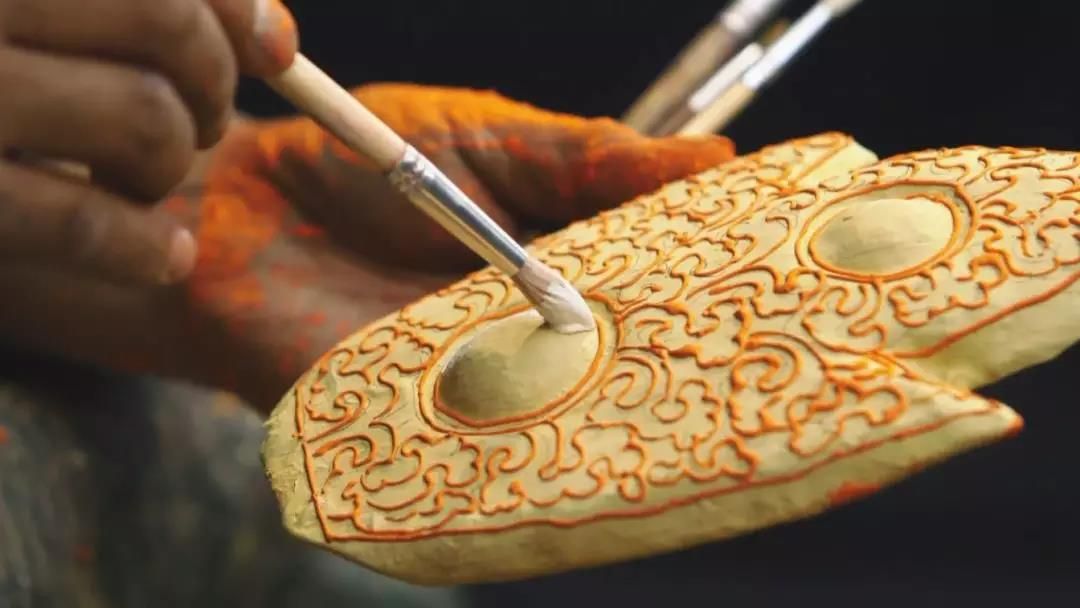 在等待膠布面具晾干的時(shí)候,扎西去到了兒子練習(xí)跳舞的地方,在外面遠(yuǎn)遠(yuǎn)的看著兒子練舞。原本希望兒子繼承他這手藝的心思,在看到兒子真心喜歡藏舞后,也被漸漸放了下來(lái)。回到家中,膠布面具已經(jīng)干透,開(kāi)始了制作面具中最重要的一環(huán):上顏色。隨后上頭發(fā)、簪子等小零件,一個(gè)薩迦面具終于制作完成。