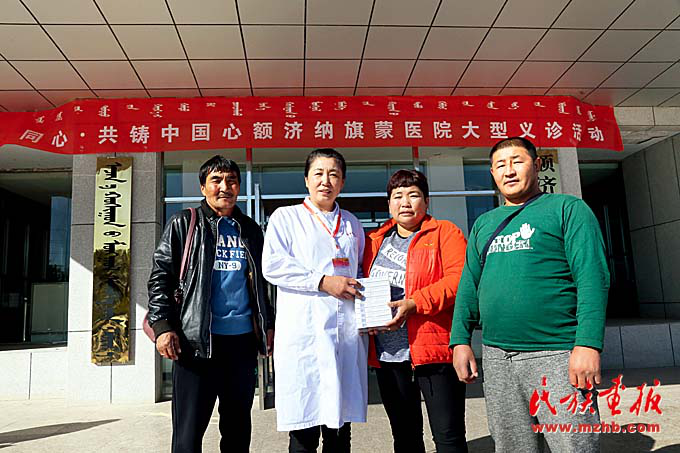 在額濟納旗蒙醫(yī)醫(yī)院開展的義診活動上,專家們向蒙古國患者贈藥。