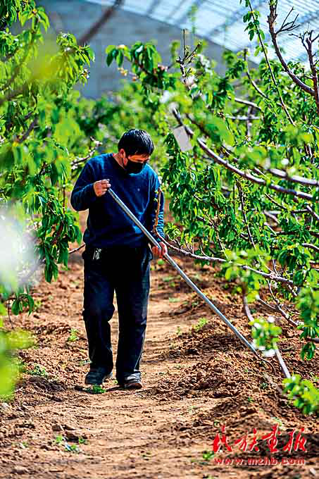 2020年3月,洪浩爾敖包村的貧困戶李玉山在大棚里給櫻桃樹鋤草。(新華社 供圖)
