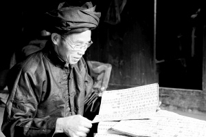 貴州省榕江縣水尾水族鄉(xiāng)水盆村地處月亮山深處,與外界接觸少。目前,該村村民仍穿水族服裝,講水族語言。該村有169戶共796人,水書先生有10人。他們保存水書1000余冊(cè),其中, 有成書50年以上的水書300余冊(cè)。圖為水書先生王明先在向人們展示水書。