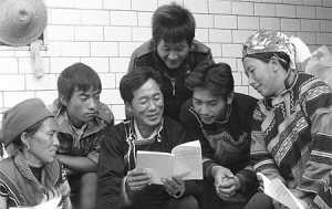 四川省西昌市大箐鄉(xiāng)民主村彝族群眾學(xué)習(xí)彝文版《十七大報(bào)告》。 資料圖片