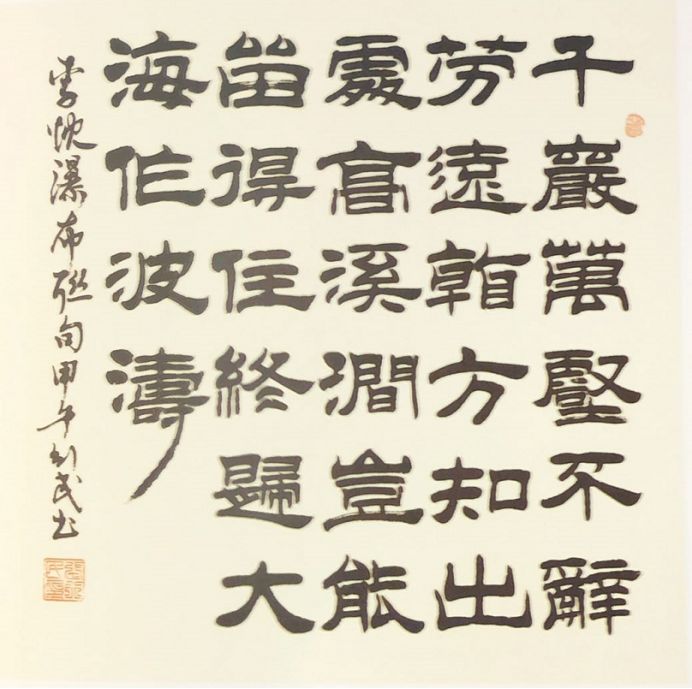 張行民的書法作品博覽眾家之長,悉心揣摩隸書之要義,領(lǐng)悟其精髓,加入其心志與感悟,漸漸形成了自己的風(fēng)格。他的作品灑脫飄逸,體骨厚重,參合有各派書體的筆意,同時又有自己個性和意境的張揚,字體端莊英武,體象收放凝度。賞其書法,總能給我們一種“渾然陣列,筋道玉骨”的美感,實屬不可多得。