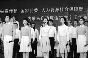 9月14日,來(lái)自中國(guó)傳媒大學(xué)、內(nèi)蒙古大學(xué)的學(xué)生代表和鄂爾多斯市群眾代表在全國(guó)推普周開(kāi)幕式上朗誦《讀中國(guó)》。新華社記者 朱文哲攝