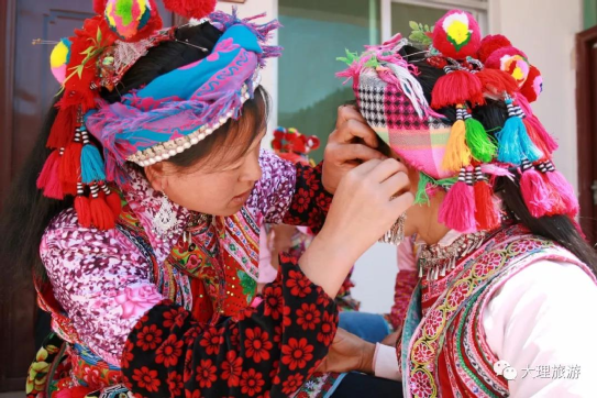 踏歌會(huì)上,來(lái)自彌渡彝族聚居地的各村各寨男女老幼穿戴整齊,云集在鐵柱廟,這里便形成了五彩斑斕的彝族服飾比賽場(chǎng),每位彝族婦女的頭飾就是她心靈手巧的見證。