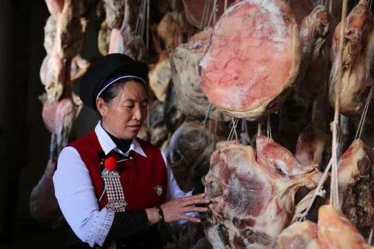 鶴慶火腿的美名,在滇西廣為傳頌。鶴慶火腿,又稱“圓腿”或是“盤腿”,取自其圓整的外形。制作鶴慶火腿,要精選皮薄肉嫩的后腿,經(jīng)過(guò)晾透、扎孔、噴酒、撒鹽,反復(fù)的摩擦之后,腌制陰干,鶴慶火腿滋味鮮美,咸香不膩,蒸制,煸炒,亦或是加在其他菜肴中增香提味,都是上佳選擇。