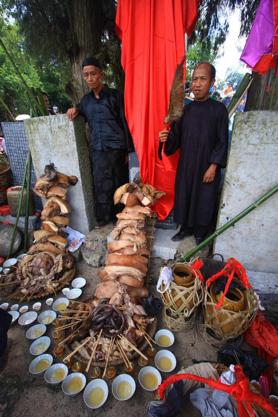 人們傳說只有醉倒了"霞神",它才能永遠(yuǎn)留在這方,才能使這里風(fēng)調(diào)雨順。當(dāng)水書先生念了最后的咒詞,祭典才在鼓樂聲和歡呼聲中結(jié)束。最后,各族系將祭肉一并聚攏,聚餐慶祝。天黑之后,人們秘密地將"霞神"收藏起來,至此,"敬霞"活動(dòng)全部結(jié)束。