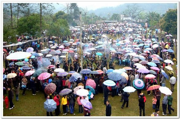 香粉古龍坡會(huì)于每年農(nóng)歷正月十六舉行,所以又名“十六”坡。這一天、來(lái)自外國(guó)朋友、各地的游客及當(dāng)?shù)胤綀A十里的苗哥苗妹,提蘆笙,提鳥籠、牽馬匹,打花傘……朝著十六坡趕來(lái)。正午時(shí)分,山梁上、村道間、河溪旁,出現(xiàn)了成列成隊(duì)穿紅戴綠的人群。遠(yuǎn)遠(yuǎn)望去,似一條彩帶在飄動(dòng)。當(dāng)萬(wàn)余人匯集后,整個(gè)坡地就成了彩色的世界。