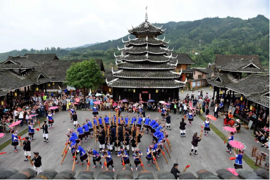 過年期間,各家各戶姓氏輪流過節(jié),親朋好友都會集中前往,最后到鼓樓坪唱歌跳舞慶祝侗年。——程陽八寨景區(qū)