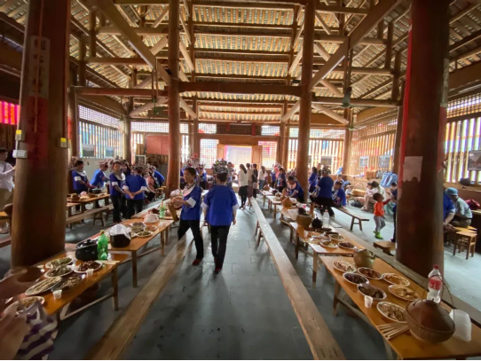 “百家宴”是侗族待客的最高禮儀。每逢村寨互訪或有特別尊貴的客人來時,全村各戶自備酒菜飯,一起到鼓樓坪“一”字型擺開長桌,客人可從第一桌吃到最后一桌,你來我往、觥籌交錯、熱鬧非凡。據(jù)說在當?shù)亓鱾髦@樣一個說法:“吃百家飯、納百家福、聯(lián)百家心、驅百家邪、成百樣事、享百年壽”——各寨