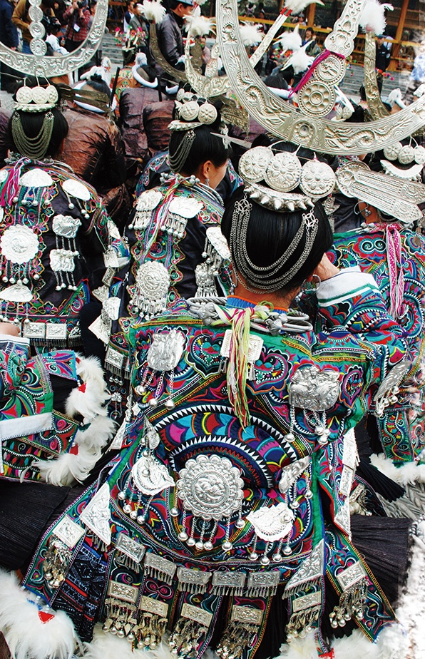 亳無疑問,蝴蝶圖騰即是對(duì)蠶的崇拜,蠶文化原初的核心便是人歸途的儀式,人要在這種和蠶一祥的儀式中得到再生。今天的苗族,仍然保持著以絲綢裹身而葬的喪葬習(xí)俗。我祖母養(yǎng)蠶織就的絲織品,我們習(xí)慣稱作蠶絲床單,絕大部分是備著喪葬所用。凡有人去世,主客必送一床蠶絲單,沒有是不行的,被視為不懂禮節(jié),而死者獲得蠶絲單越多越好。有的人家收到的蠶絲單過多,就會(huì)保存一部分,留著將來的喪事送禮。苗族每個(gè)人都必備一件絲質(zhì)壽衣。并且,在許多重大的儀式活動(dòng)中必須要著絲綢服裝。比如在苗族重大的鼓藏節(jié)期間,鼓社頭必須穿絲織鼓社服;大祭典活動(dòng)時(shí),祭師也必須穿絲質(zhì)服裝等等。