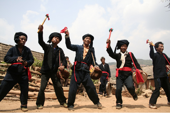 現(xiàn)今的蜂桶鼓直徑一般25—30厘米,高70—80厘米,以攀枝花樹或柳樹挖空樹心,兩端蒙上牛皮制成,形似蜂桶。鼓棒直徑3—4厘米,長40—50厘米,兩端系有彩色布條。