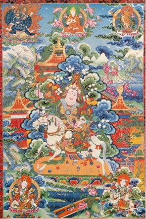 勉塘畫派是15世紀(jì)以后影響最大的繪畫流派,主要流行于衛(wèi)藏地區(qū)及昌都部分地區(qū)。該畫派的創(chuàng)始人是勉拉頓珠,他出生于洛扎勉塘(今山南地區(qū)),勉塘畫派由此而得名。他大約出生于公元十五世紀(jì)20年代或30年代。據(jù)史料記載,勉拉頓珠出生的時(shí)間正好與他家鄉(xiāng)發(fā)現(xiàn)了朱砂礦的時(shí)間一致。這種重要繪畫顏料的出現(xiàn),預(yù)示著一代繪畫大師降臨人世。他自幼聰慧,毫不費(fèi)力地學(xué)完各種字體的書寫、大小五明中的絕大多數(shù)內(nèi)容。成年后,拜后藏一帶的著名美術(shù)大師多巴扎西杰布為師,苦心鉆研,在繪畫藝術(shù)領(lǐng)域取得了很深的造詣。通曉了藏、漢、印、尼泊爾等各種繪畫派別的技法,他根據(jù)《續(xù)部》等編寫了繪畫理論專著《造像量度如意寶》,并創(chuàng)立了勉塘畫派。他參與了一世達(dá)賴?yán)锔刂彀团c1447年創(chuàng)建的扎什倫布寺措欽大殿壁畫繪制工程的全過程,單獨(dú)完成了北壁的《釋迦牟尼與十六羅漢圖》與《八十大成就者環(huán)圍金剛持》兩幅壁畫,在西壁勉拉頓珠親手繪制了《釋迦牟尼十二宏化圖》的白描部分。另外在該寺以及同時(shí)代建造的諸多廟宇繪制完成了大量的壁畫、巨幅堆秀唐卡及小型唐卡。其中最負(fù)盛名的是扎什倫布寺的巨幅堆秀唐卡《釋迦牟尼》,其大小約為長(zhǎng)32.9米、 寬19.3米。該畫派造像法度精嚴(yán),與傳統(tǒng)的表現(xiàn)手法相比,尤其注重線條的運(yùn)用,線條工整流暢,色調(diào)活潑鮮亮,變化豐富,人物體態(tài)、骨相和肌膚都異常完美,脖頸較長(zhǎng),高度和諧的色彩和色調(diào)的配制十分突出。畫面暈染充分,用色細(xì)膩、柔和、富麗堂皇。由于石青和石綠色突出,從遠(yuǎn)處看,繪畫作品十分優(yōu)美和靜。衣袍和飾帶呈不對(duì)稱形式,棋格使構(gòu)圖消失,諸神位于云端風(fēng)景之中,布局活躍多變,背光中卷草圖案等變成了波浪式放射的金線,該派擅長(zhǎng)表現(xiàn)和靜類神像。
