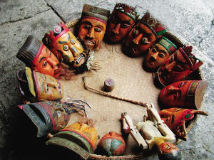 現(xiàn)在的16具面具,是班主宋成權(quán)在1997年春帶著戲班子成員,從正月初一到十五,逐家逐戶跳花燈收賀錢和群眾集資共籌集資,然后由宋成權(quán)到重慶酉陽(yáng)請(qǐng)師傅雕刻的。