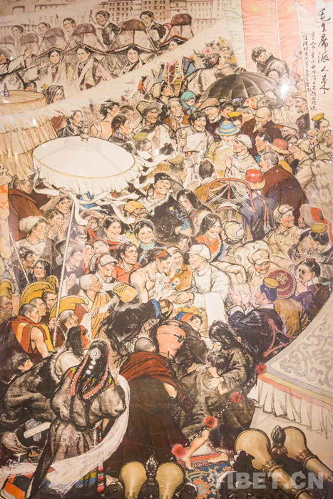 鑒賞展現場,不少前來參觀的畫家都是韓書力的學生或在一定時期曾受其教導?!?973年,我在西藏自治區(qū)展覽館見到了韓書力老師,第一次見面我就拜了師。我們一起下鄉(xiāng),我就給他當導游和翻譯。30幾年來,我一直在學習韓老師的繪畫技法,到現在還是他的學生。韓老師創(chuàng)作《毛主席派人來》時,我就跟在旁邊學習。學到了一些創(chuàng)作獨幅作品的技巧和手法,讓我受用至今?!蔽鞑厍嗄戤嫾矣嬅莱嗔姓f。
