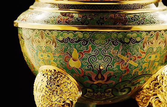 “范銅為質(zhì),嵌以銅絲,花紋空洞,雜填彩釉,夕謂之景泰藍(lán),今謂之琺瑯”——這是晚清《陶雅》中對于景泰藍(lán)的形象描述。清朝時期,景泰藍(lán)的制作工藝和地位更是達(dá)到了頂峰??滴跏拍?,武英殿、養(yǎng)心殿設(shè)立造辦處;康熙五十七年,武英殿“琺瑯作”改歸養(yǎng)心殿專門制造宮廷專業(yè)器物,皇帝親自授意進(jìn)行景泰藍(lán)的制作,景泰藍(lán)工藝達(dá)到鼎盛時期。