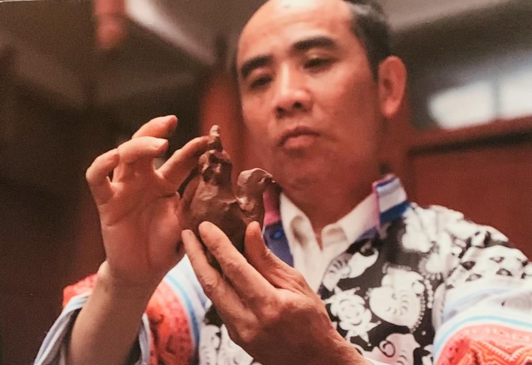黃平縣舊州鎮(zhèn)泥哨傳承人陳應(yīng)坤在制作泥哨(許覬佳攝于貴州省博物館)