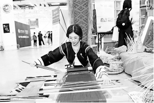 2021年5月,在第六屆全國大學(xué)生藝術(shù)展演活動現(xiàn)場,海南師范大學(xué)學(xué)生展示黎族腰織機織錦技藝。第六屆全國大學(xué)生藝術(shù)展演活動組委會供圖