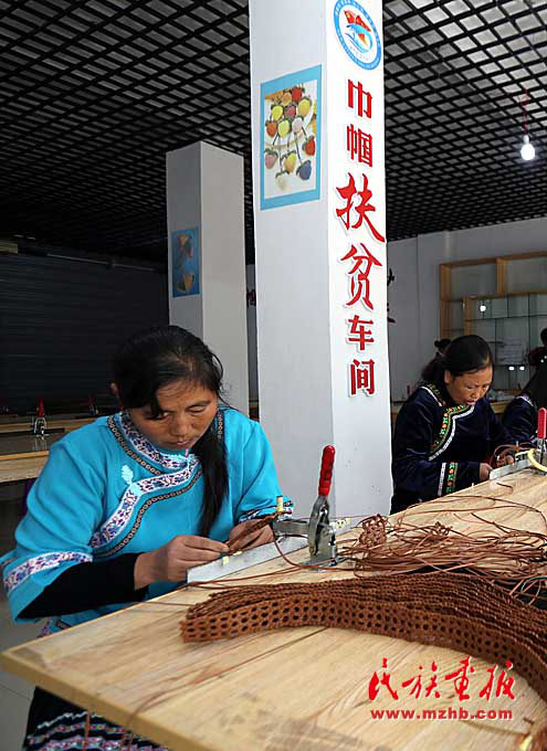 婦女們在巾幗扶貧車間編織訂單產(chǎn)品。