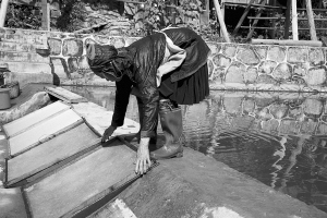 占里村共有182戶827人,這里的侗族古法造紙術源遠流長,全村從事造紙業(yè)的就有170戶,占總戶數(shù)的93%。這里的造紙業(yè)依然保留著原始的家庭作坊和世代傳承的手工制作方式。這種古法造紙技藝以構樹皮為原材料,添加獼猴桃藤、野棉花根,經(jīng)過水浸泡、石灰腌制、蒸煮、碓爛、攤曬、燒堿漂白、打漿、瀝水、抄紙、烤干等72道工序,最終制成白皮紙。