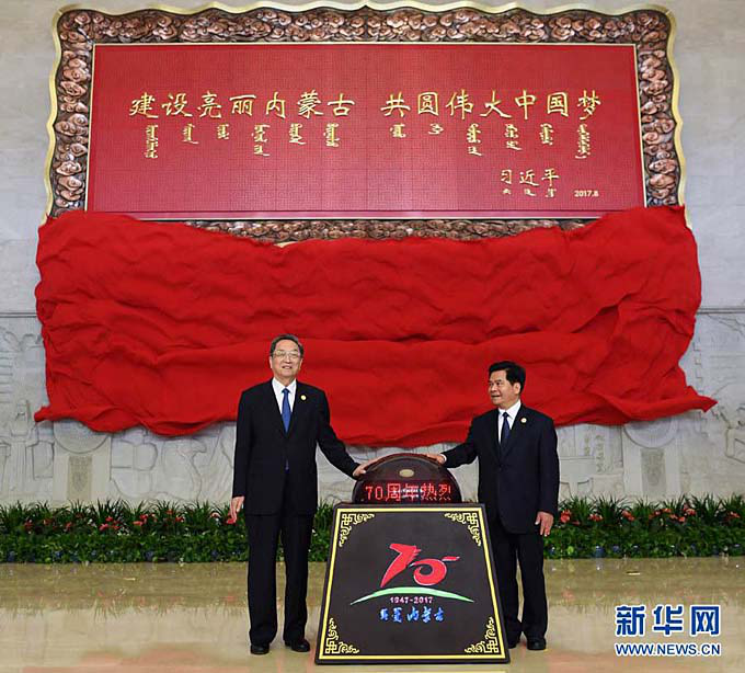70年來,在黨中央高度重視、關(guān)心關(guān)懷下,內(nèi)蒙古各族人民在革命、建設(shè)和改革的各個歷史時期,創(chuàng)造了一個又一個人間奇跡,萬里草原發(fā)生了翻天覆地的歷史巨變。圖為8月7日,中共中央政治局常委、全國政協(xié)主席、中央代表團(tuán)團(tuán)長俞正聲率中央代表團(tuán)出席向內(nèi)蒙古自治區(qū)贈送紀(jì)念品儀式,俞正聲和內(nèi)蒙古自治區(qū)黨委書記、人大常委會主任李紀(jì)恒一同為習(xí)近平總書記題詞賀匾揭幕(新華網(wǎng))
