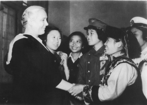 1955年9月蘇聯(lián)卓婭和舒拉的媽媽(左一)訪問中國時接見中國的“瓦爾瓦娜”(蘇聯(lián)電影《鄉(xiāng)村女教師》女主角)、全國青年社會主義建設(shè)積極分子阿角(右一),時有郝建秀(左三)、徐建春(左二)同志在場。 資料圖片