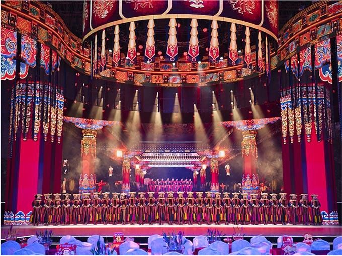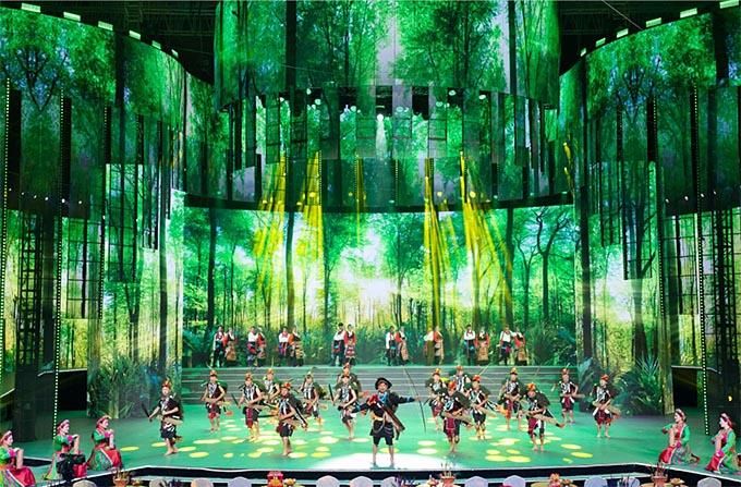 在舞美上,晚會傾力打造中華文化概念,突出鑄牢中華民族共同體意識,建構(gòu)熱烈祥和的觀演環(huán)境、身臨其境的現(xiàn)場體驗(yàn)、自然流暢的互動(dòng)場景,以更炫麗、更時(shí)尚、更具生命力的節(jié)目內(nèi)容和形式,為觀眾提供技術(shù)與藝術(shù)完美結(jié)合的視聽盛宴。主創(chuàng)人員別具匠心地把舞臺設(shè)計(jì)成一個(gè)具有民族特色的大客廳,寓意各族兄弟姐妹溫暖團(tuán)聚,營造既有民族特色又有時(shí)代氣息的視覺空間。