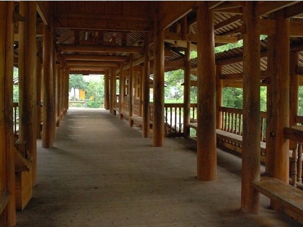 風(fēng)雨橋以石拱木作,廊、屋、亭、閣為一體,造型別致、美不勝收。無論是遠(yuǎn)眺還是進觀,都體現(xiàn)出獨特的審美意境。鏈接廊橋與屋亭的是長條青石,橋與村寨的連接則用花石鋪路,橋面主體是當(dāng)?shù)厮寄静?。這種自然生態(tài)環(huán)保的理念,更彰顯了瑤族人民獨特的審美境界。