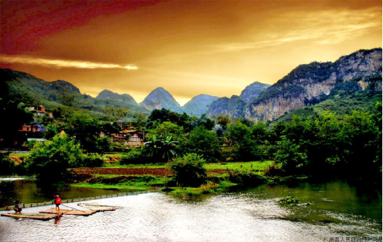 壩美,為壯語譯漢語為:壩—沖口,美—樹 ,因居住的沖口樹木多而得名。壩美村位于珠江流域西江水系馱娘江上游的阿科河畔。屬喀斯特地貌,區(qū)域內(nèi)山峰奇特,河谷幽美,阡陌縱橫,河流山泉蜿蜒奔流,溶洞層疊散布在山體峰內(nèi),冬無嚴(yán)寒,夏不酷暑,氣候宜人。因四面環(huán)山,不通公路,進(jìn)出寨子主要靠村前村后兩個天然的石灰溶巖水洞,村民們要摸著巖壁趟水、撐竹筏、劃獨(dú)木舟、坐小船,經(jīng)過950米長的幽暗的“出水洞”和680米長的“湯拿洞”才能進(jìn)出。由于地處偏僻,交通不便,基本不與外界交往,多年來壩美村長時期與外世隔絕。壩美村水源豐富,氣候溫和,自然生態(tài)環(huán)境未被污染,負(fù)氧離子質(zhì)數(shù)高出城市數(shù)倍,游人在此休憩,心曠神怡,是一個溫濕潤,四季宜人的旅游勝地。就生態(tài)環(huán)境和歷史淵源來說,《桃花源記》問世1500多年,只聞其名,不見其實。相傳除唐代確認(rèn)湖南省桃源縣的桃源洞為其原型外,目前全國就有冠名“世外桃源”的地名16個之多。而今天的壩美,不僅十分相似,而且還神似東晉文學(xué)家陶淵明筆下所描寫的“林盡水源,便得一山。山有小口,仿佛若有光;便舍船從口入……土地平曠,屋舍儼然,有良田美池桑竹之屬;阡陌交通,雞犬相聞……”的世外桃源。而且在當(dāng)?shù)卮迕裰杏性S多歷史傳說:北宋皇祐四年(公元1052年),壯族起義領(lǐng)袖儂智高在邕州(南寧)昆侖關(guān)被狄青打敗后,退入以其繼父儂夏卿為首領(lǐng)的特磨道(廣南)后,至和二年(1055年),宋朝廷又派楊文廣領(lǐng)兵進(jìn)剿,儂智高在突出重圍轉(zhuǎn)至阿科(今廣南縣壩美鎮(zhèn)治所)與宋軍周旋,終因寡不敵眾而離開阿科轉(zhuǎn)戰(zhàn)于丘北、開遠(yuǎn)、蒙自、元江等地,后到大理不知所終。
