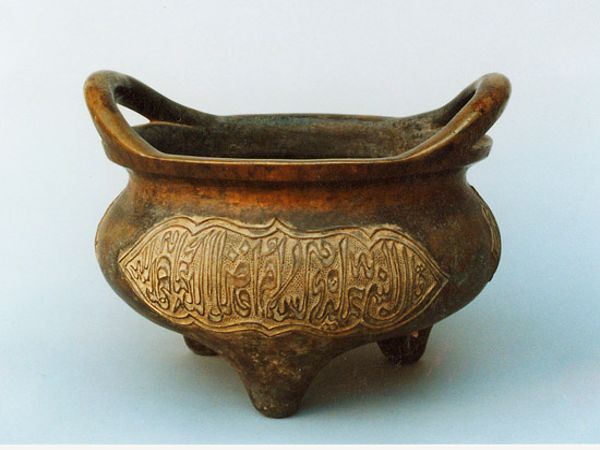 侈口、方唇、窄卷沿、矮束頸、扁鼓腹,口沿立一對橋形耳,底部以矮小的三乳足支撐整個爐身。外腹壁兩大兩小四組開光內(nèi)均以珍珠紋為底,陽刻有阿拉伯文字,漢譯為:“最貴的記主詞(吉克爾)是念清真言(萬物非主,唯有真主,穆罕默德是真主的使者)”,底款漢文四字篆書“宣德年制”。阿拉伯文構(gòu)成此爐的主體紋飾,圖案別致,內(nèi)涵深奧,寓意獨特,雕刻手法精細(xì)、嫻熟,線條婉轉(zhuǎn)流暢,自然雅致,具有韻律之美。該器物銅質(zhì)精良,造型優(yōu)美,工藝考究,將冶鑄、雕刻技術(shù)與阿拉伯文書法絕妙融合,堪稱回族文物中的珍品。