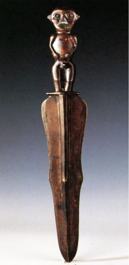 首先是對當(dāng)?shù)匦率鲿r(shí)代文化因素的繼承和延續(xù),以男女立人形青銅短劍為例,其圓雕人像造型,是對遼西地區(qū)人形雕塑傳統(tǒng)的繼承。與小河西文化陶塑人頭像、興隆洼文化石雕人像、趙寶溝文化陶塑人頭像、紅山文化陶塑人像、小河沿文化人形陶壺等一脈相承,雖然人像造型和載體略有不同,但未曾間斷,體現(xiàn)了遼西地區(qū)史前文明的祖先崇拜和宗教祭祀禮儀傳統(tǒng)的延續(xù)性。人像造型既是禮制的最高呈現(xiàn),同時(shí)具有標(biāo)志身份和地位的功能。